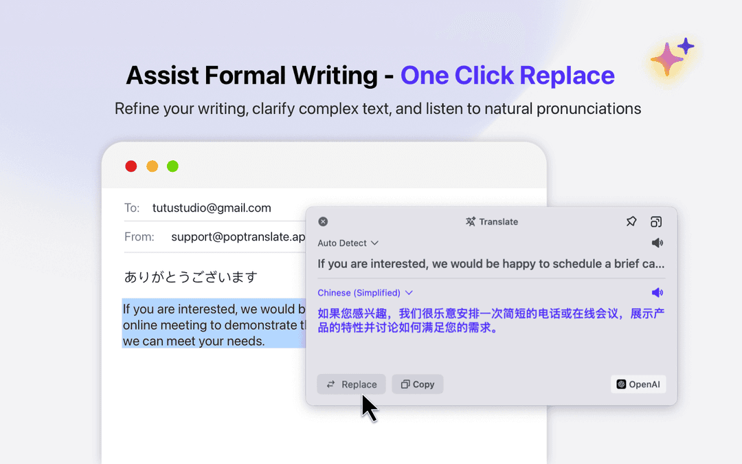 PopTranslate is an easy-to-use native app powered by multiple AI engines, helping you translate and communicate in different languages effortlessly.